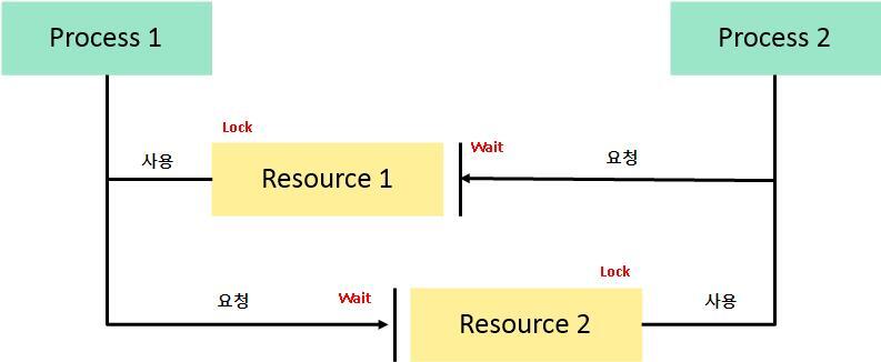 t1에 p1이 리소스 1을 얻고, p2가 리소스 2를 얻었다면, t2때 p1은 리소스 2를, p2는 리소스 1을 기다리게 된다.