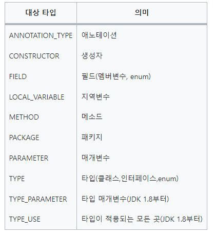 - '@Target'으로 지정할 수 있는 적용 대상의 종류는 다음과 같다.