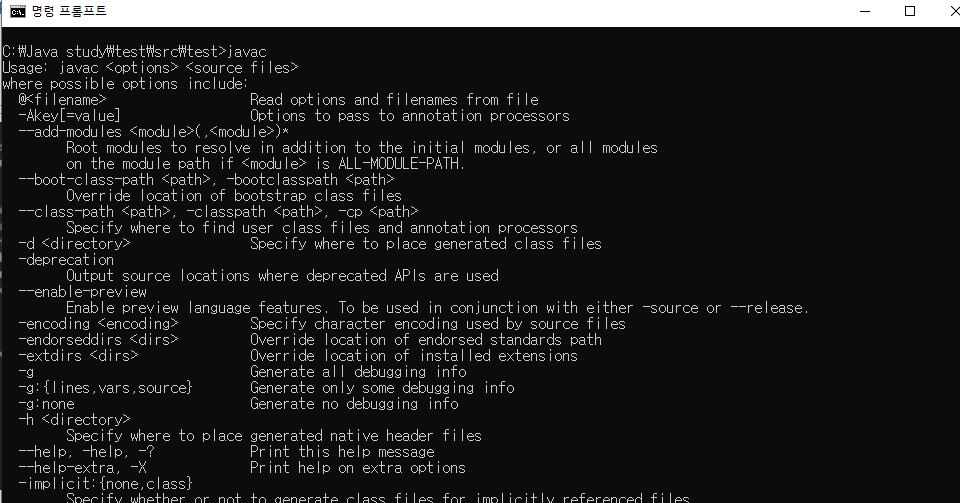 'javac' 를 통해서 컴파일을 한다. 터미널에 'javac'를 입력하면 사용법을 볼 수 있다.