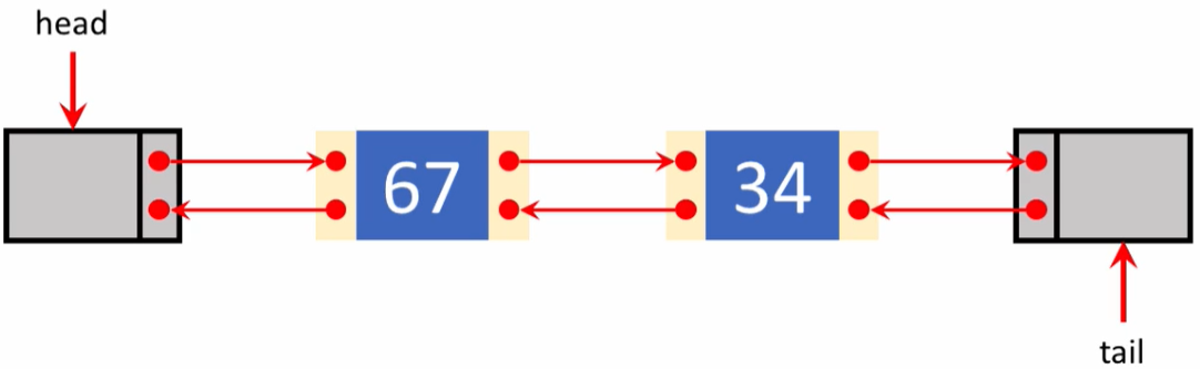 양 쪽으로 링크를 연결하여 앞으로도 (다음 Node) 뒤로도 (이전 Node) 로도 진행이 가능한 연결리스트이다. 리스트의 처음과 끝에 Dummy Node를 두어 데이터를 담고 있는 Node들이 모두 같은 모양이 되도록 한다.