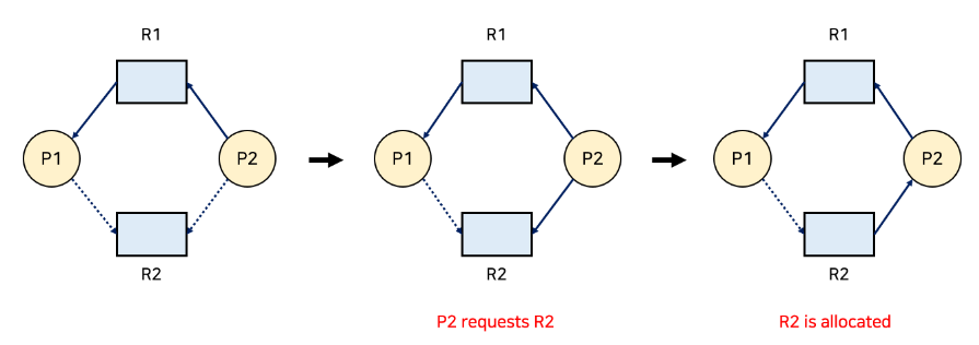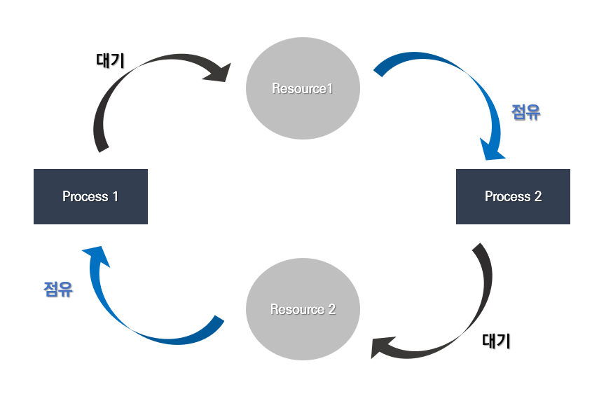 ex) 프로세스 p0, p1, p2, ..., pn이 있을 때, p0은 p1을 기다리고 p1은 p2를 기다리고,.., pn은 p0을 기다린다.