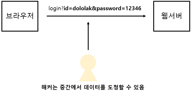 만약 해커가 중간 통로를 도청하게 된다면 중요한 정보들을 탈취해 낼 수 있을 것이다. 만약 이러한 데이터가 로그인 기능에서 사용하는 아이디 비밀번호 등의 개인정보라면 치명적일 수 있다. 뿐만 아니라 정상적인 데이터를 중간에서 악의적으로 변조시키는 것도 가능하다.