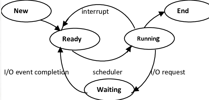 - process- state : 프로세스의 라이프 타임과 관련된 상태로, waiting, running, ready, blocked, end, suspend-wait, suspend-ready 가 있다
