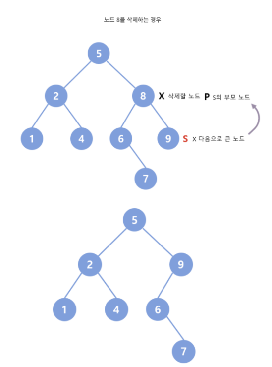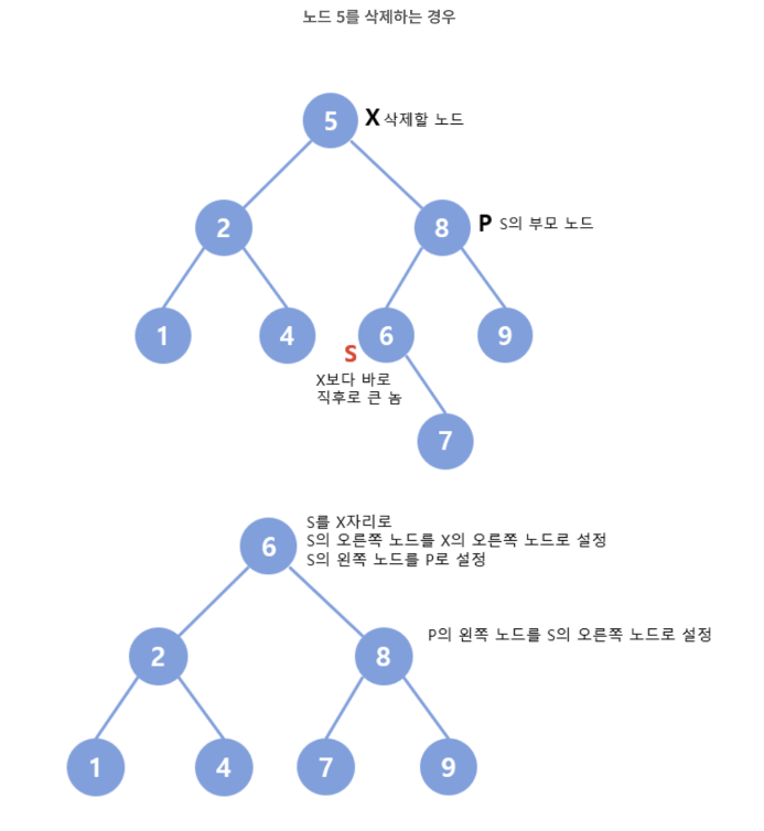 삭제되는 노드보다 바로 다음 (큰) 키를 가지는 노드를 찾아 그 노드를 삭제되는 노드 자리에 대신 배치하고 해당 노드를 삭제한다.