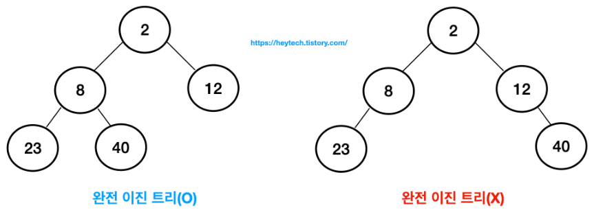 - 완전 이진 트리란 각 노드가 최대 2개의 자식 노드를 갖는 트리 형태의 자료구조 로서 마지막 레벨을 제외한 모든 노드는 완전히 채워져 있어야 한다.