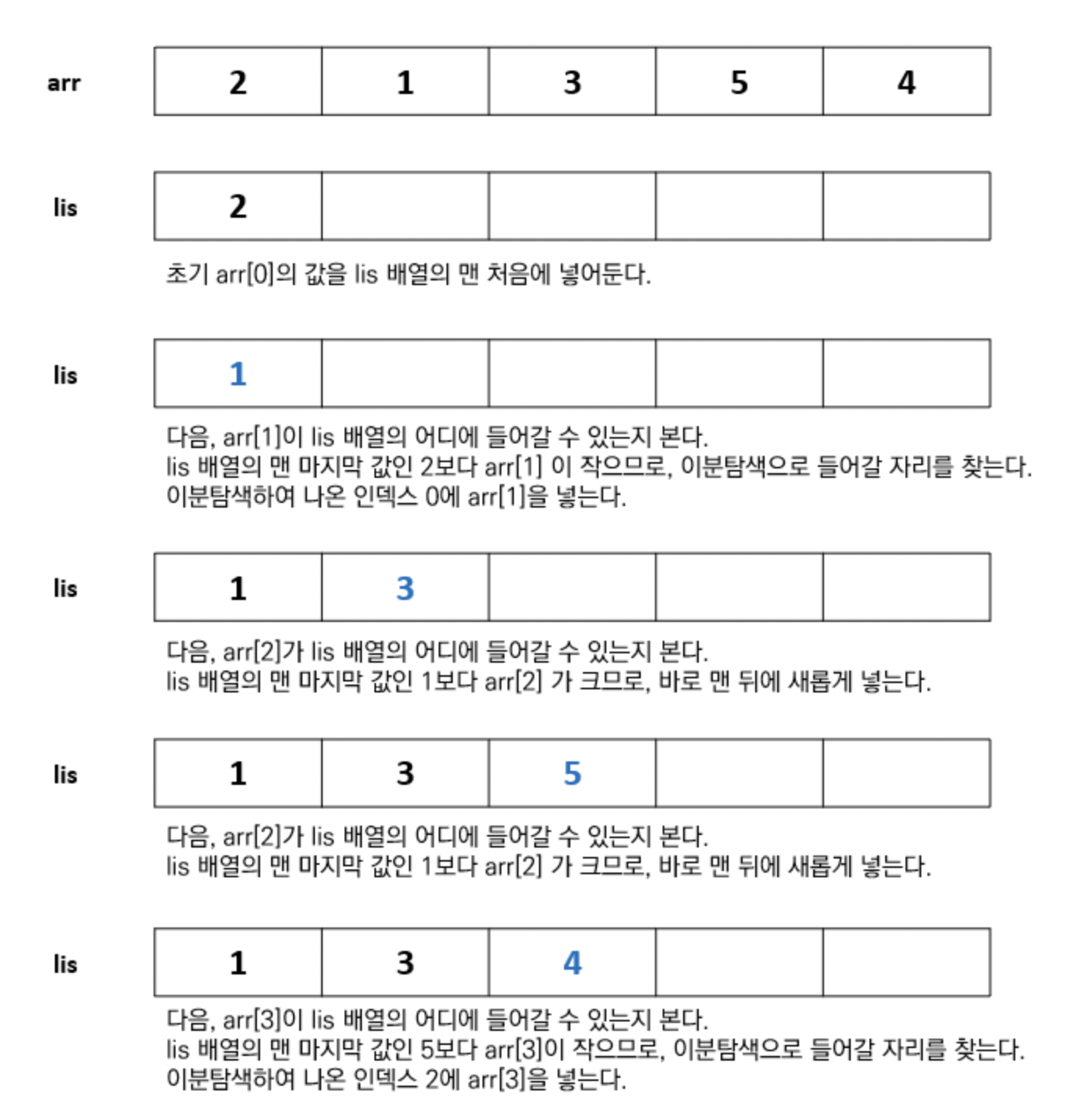 이 알고리즘은 다음과 같이 리스트 lis 를 업데이트 하며 동작한다.