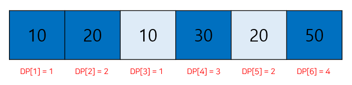 입력 받은 arr 배열이 [10, 20, 10, 30, 20, 50] 라고 할 때 DP 배열은 다음 그림과 같이 [1,2,1,3,2,4]가 될 것이며 LIS의 길이는 DP 배열 값들 중 가장 큰 값이 될 것이기 때문에 4 가 될 것이다.