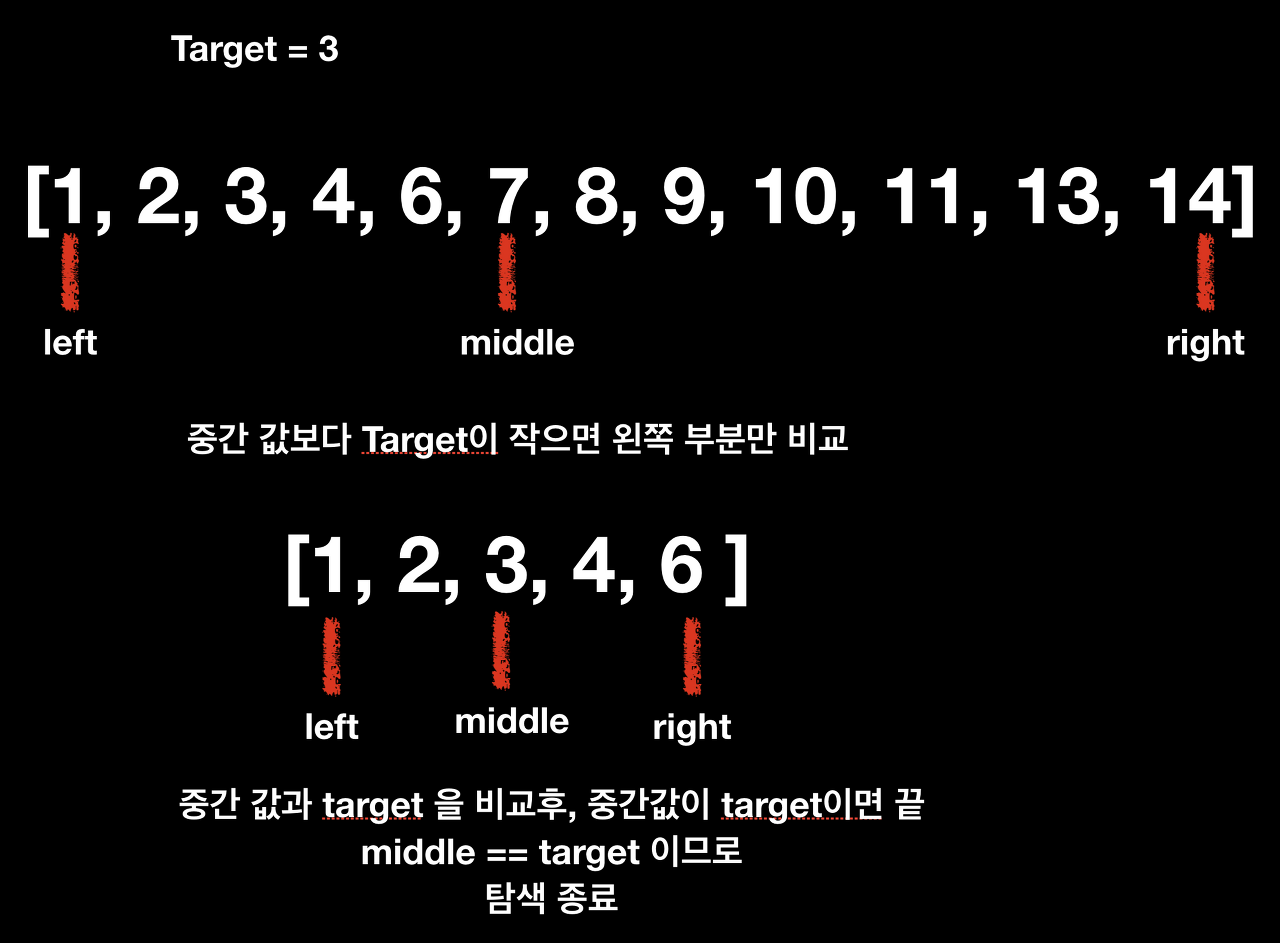 정렬되어 있는 배열에서 특정한 값을 찾아내는 알고리즘이다. 배열의 중간에 있는 임의의 값을 선택하여 찾고자 하는 값 X 와 비교한다. X 가 중간 값보다 작으면 중간 값을 기준으로 좌측의 데이터를 대상으로, X 가 중간 값보다 크면 우측을 대상으로 다시 탐색한다. 동일한 방법으로 다시 중간의 값을 임의로 선택하고 비교한다. 해당 값을 찾을 때까지 이 과정을 반복한다.