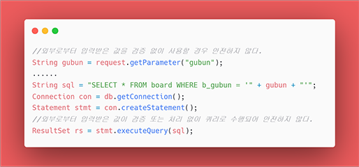 안전하지 않은 코드의 예로, 외부에서 받는 데이터인 'gubun'의 값을 검증 없이 사용하고 있다. 이 경우 gubun의 값으로 a' or 1=1 이 들어간다면 board 테이블의 전체 데이터가 조회된다.