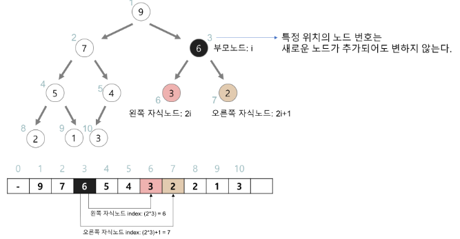 구현을 쉽게 하기 위하여 배열의 첫 번째 인덱스인 0은 사용하지 않는다.