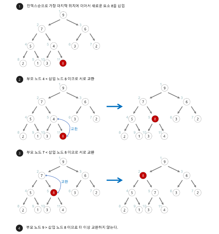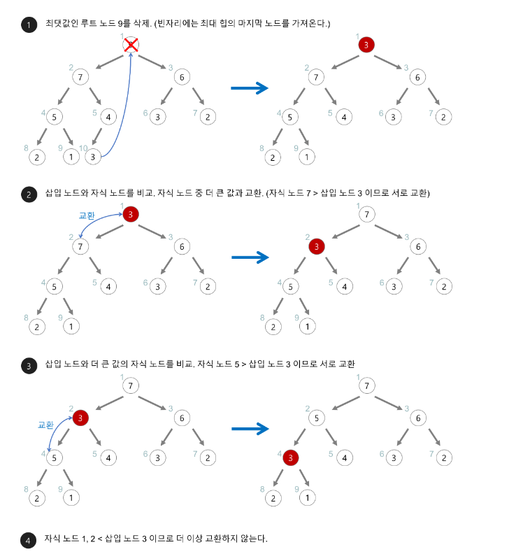 (최대 힙에서 삭제 연산은 최대 값 요소를 삭제하는 것을 의미한다.)